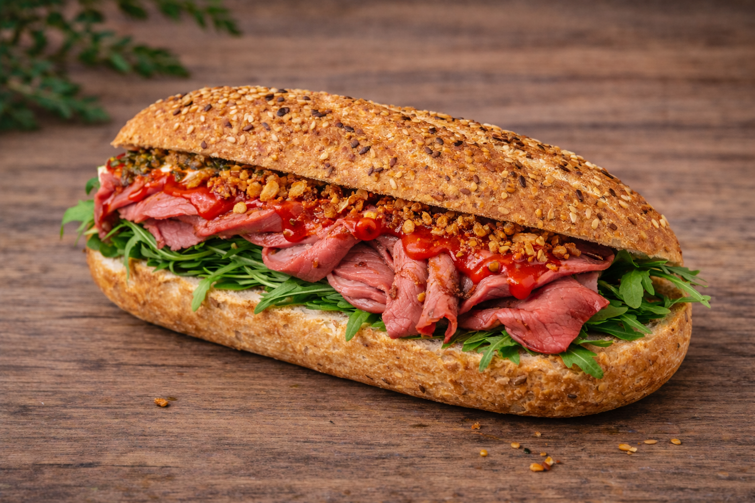 Rosbief, rucola, sambal en gebakken uitjes