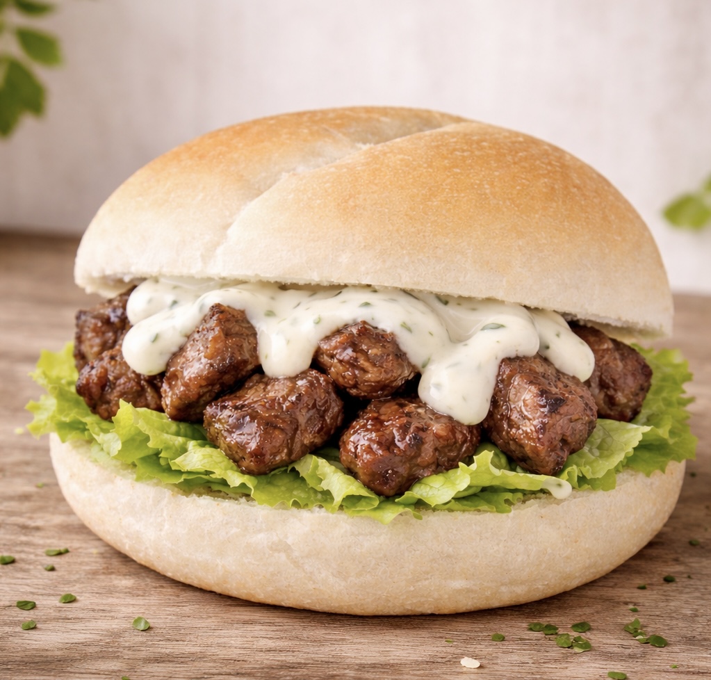Zachte witte bol met gemarineerde biefreepjes, frisse ijsbergsla en romige huisgemaakte knoflook saus